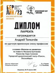 - Андрей Толкачев — диплом лауреата в номинации «За удачную временную смену профессии»