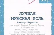 Актер театра Виктор Чариков стал лауреатом в номинации «Лучшая мужская роль» за роль Ермила Зотыча Ахова. А спектакль «Кому сон, кому явь, кому клад, кому шиш!» получил диплом в номинации «Лучший спектакль».
