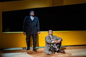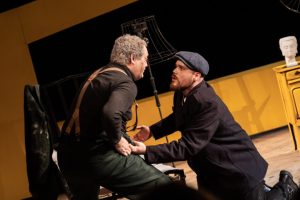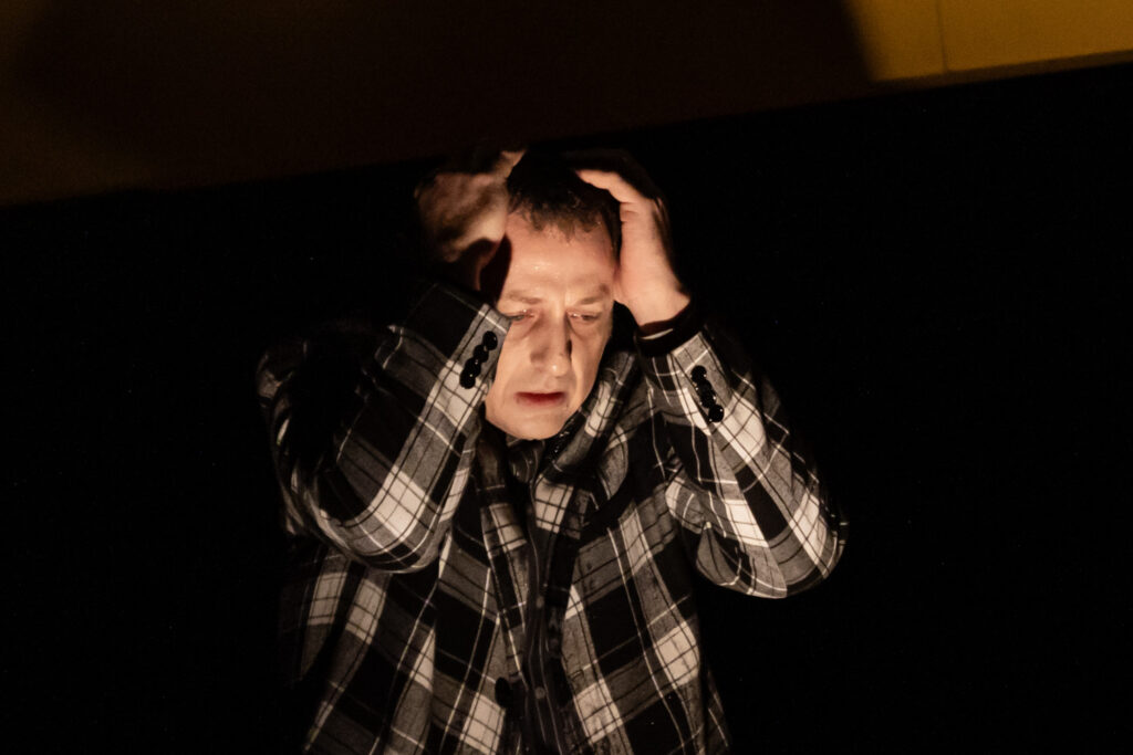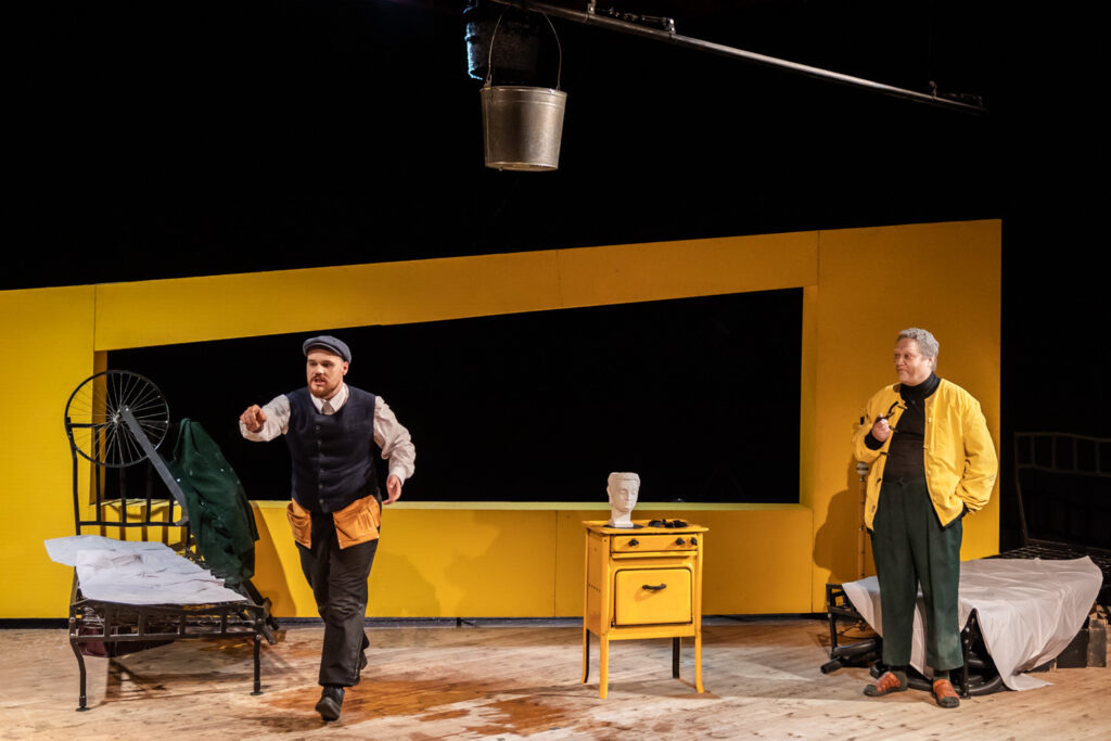 Атмосфера напряжения и угрозы в спектакле возникает с первых минут – ещё до появления актёров. Комната, где происходит действие, – словно модель замкнутого мира, где за пределами стен только пустота. Стена с окном и дверь – ярко-жёлтые, болезненно контрастные на фоне серо-чёрной палитры (художник – Нанна Шех). В них герои вглядываются с надеждой, но почти никогда не пользуются ими: выйти, измениться, сделать шаг вперёд – невозможно Пространство сцены завалено старой мебелью и вещами: коробками, пылесосом, тостером, газонокосилкой, чемоданами. Хлам словно подавляет персонажей, становясь внешним проявлением их внутреннего хаоса. И над всем этим – металлическое ведро, в которое мерно капает вода. Ритм капель – как пульс спектакля, как счётчик времени, ведущий к неизбежной развязке.