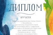 Специальный приз жюри «За талантливую работу с цифровыми технологиями в постановке для подростков» был отмечен спектакль о нашем родном городе «Лесосибирск Лойс» режиссёра Радиона Букаева.